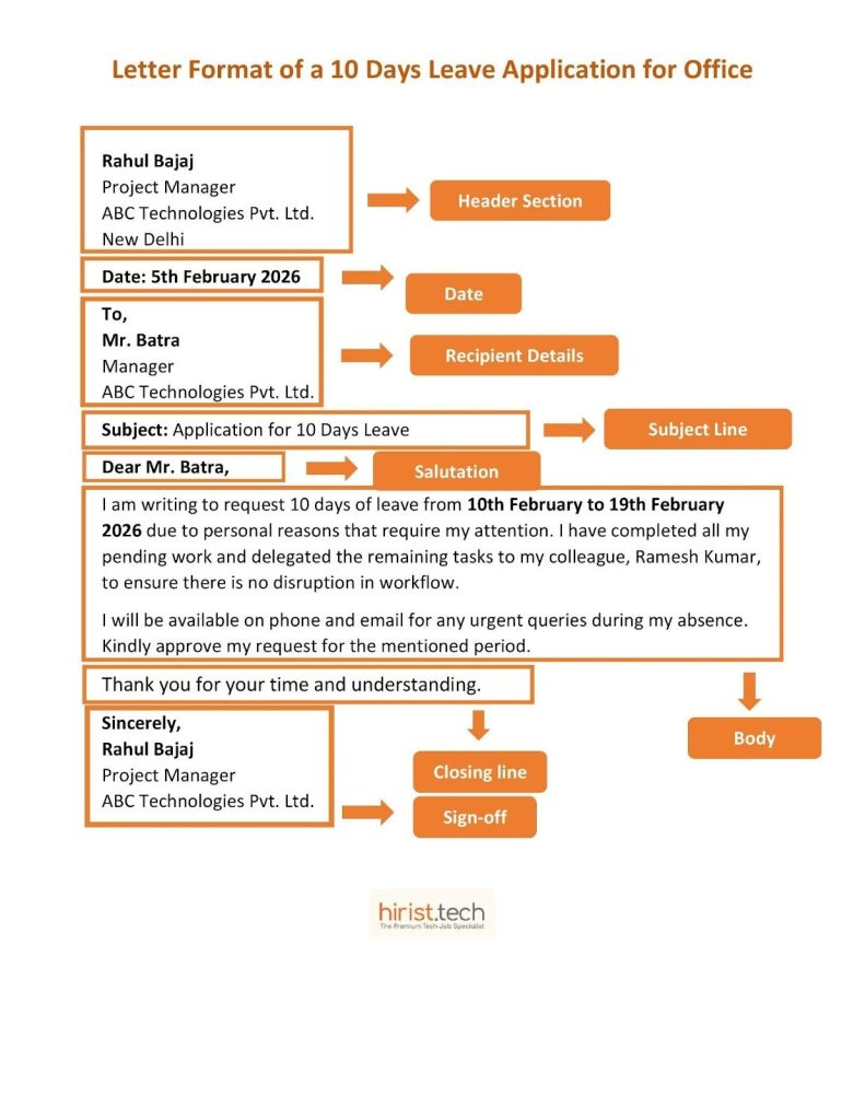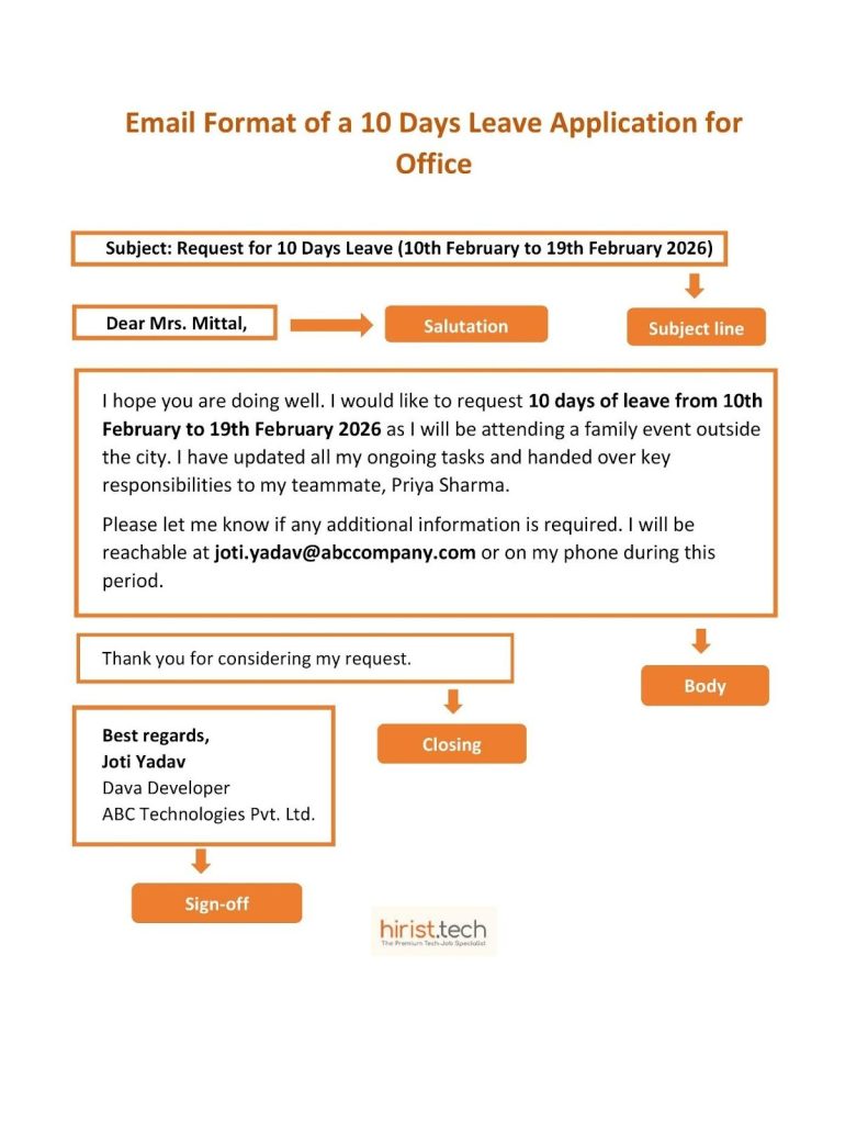 - Subject line: Write a clear subject like “Application for 10 Days Leave.”